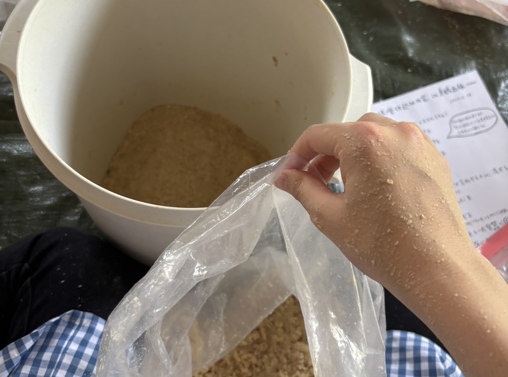 そして私が初めて参加したのが、5月の味噌仕込みのワークショップ。事前に受け取っていた乾燥大豆をおうちで柔らかく煮込んで持ち寄り、6名の参加者さんと一緒に塩と麹をすり合わせ、煮込んだ大豆をつぶすところから始まりました。