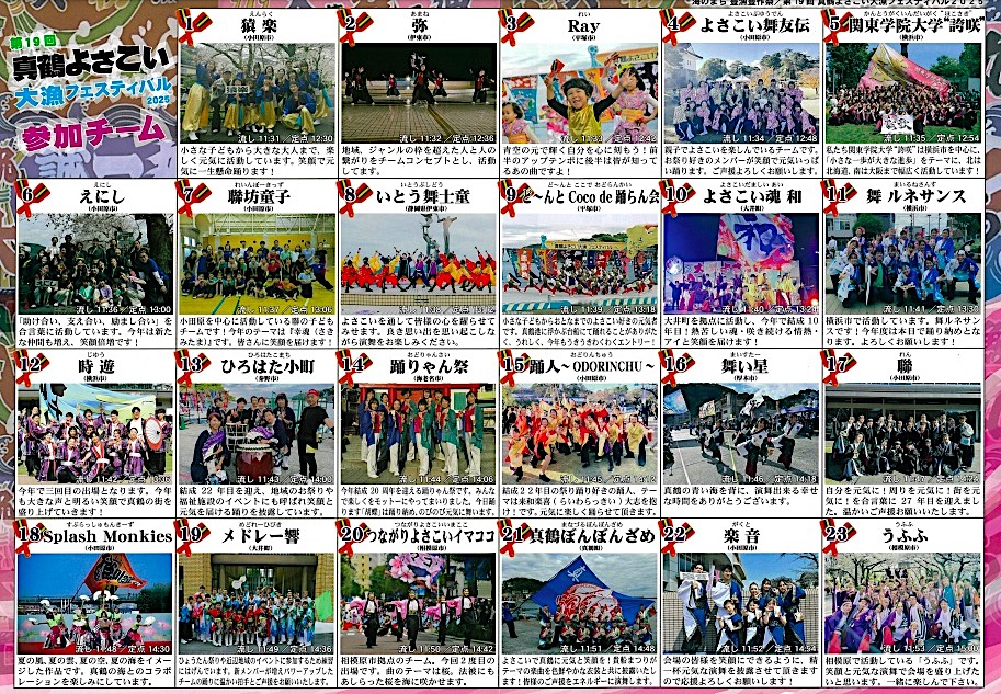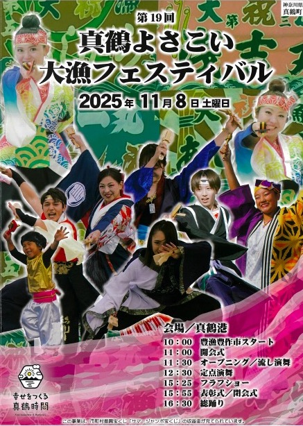 今年で第19回。真鶴ですっかりお馴染みとなったYOSAKOIは、オープニングの後11:30から華やかな衣装で漁港を練り歩く「流し」の演舞から始まって、コンテスト形式の海上特設ステージで競われます。観光協会前の漁港へお集まりください!!