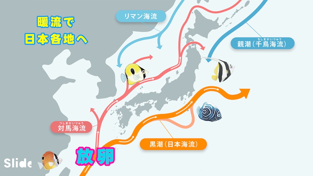 沖縄の海で生まれて、台風と黒潮に乗って関東まで流されてくるチョウチョウウオの卵。その一部はここ。真鶴半島にも辿り着いて孵化します。その小っちゃな小っちゃな赤ちゃんが「豆チョウ」ちゃんになります。
