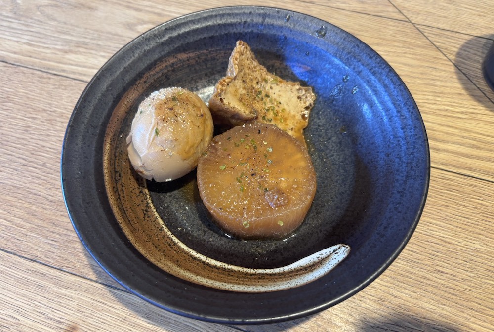 普通のおでんと似ているようでちょっと違う。黒い出し汁で煮込まれて、しっかり味が浸み込んだおでんに、パラパラと鰹節のような魚粉をふりかけて食します。デビさんの奥さんが静岡出身ということで本場の味。でも具材はカマボコの本場、神奈川産!!