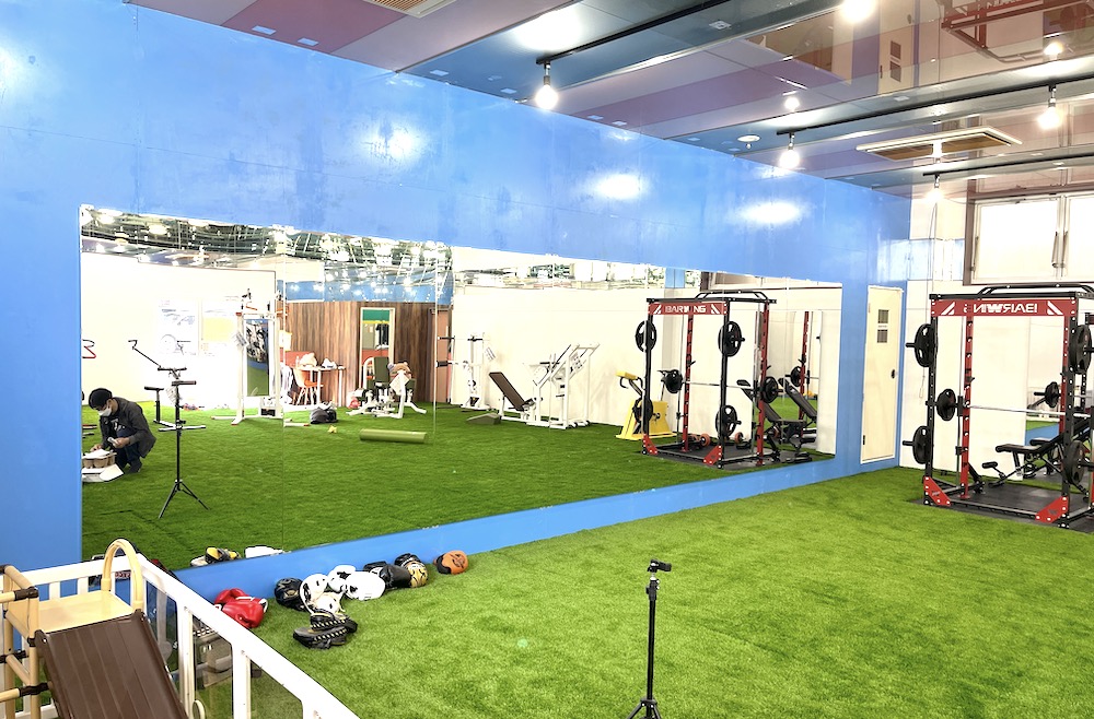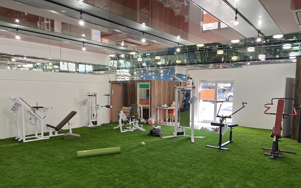 ところどころ、天井などは昔のパチンコ屋さんの面影が残されていて、レトロ感も良い感じ。床はふかふかの人工芝になっていて、とーっても柔らかい。どこでも快適にストレッチや腕立て、腹筋ができそうです。トレーニング器具も既にいくつも運び込まれていて、私には使い方も分からないようなものもありますが、充実したトレーニングが積めそう。