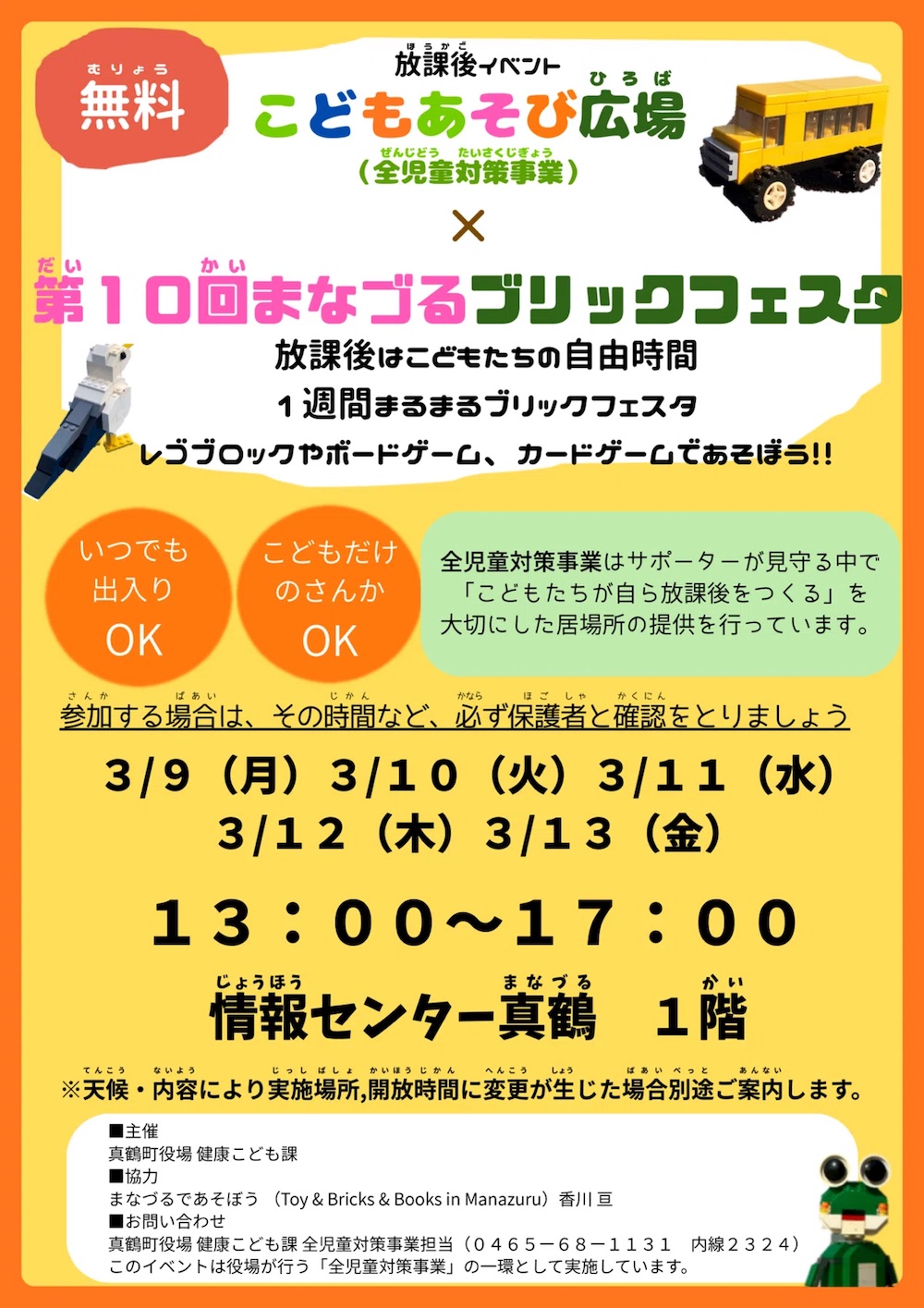今回は役場のお力もお借りして、1週間まるまる『まなづるブリックフェスタ』を開催します。明日の月曜〜金曜までは「真鶴地域情報センター1階」で真鶴町役場健康こども課、全児童対策事業の運営のもと開催。週末の3月14日(土)15日(日)は、同じ「真鶴地域情報センター1階」にて、時間と内容を増やしてスペシャルに開催!