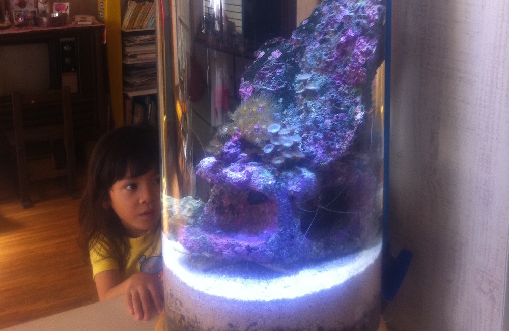 私が物心付いた時にはもう、リビングにこの水槽があったのですが、中ではクマノミが産卵し、モンツキカエルウオが顔を出し、テッポウエビとネジリンボウが穴を掘って共生し、シモフリタナバタウオが顔を隠して尻隠さずetc……関東近辺の採集ではGetできないお魚たちが長年にわたって飼育されていました。マニアックな名前ばかりですみません。