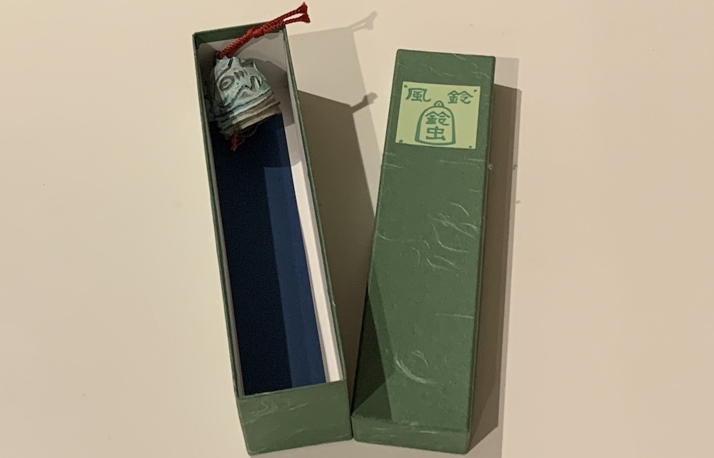出来上がった風鈴は、きちんと細長い紙製の箱に収まって、私がお土産物として売り出したい時のイメージぴったりです。取り出して「ちり〜ん」と振ってみると、良い音色!! 比べた訳ではありませんが、よくあるガラス製の風鈴より、澄んだ音の残響音が長〜く続く気がします。