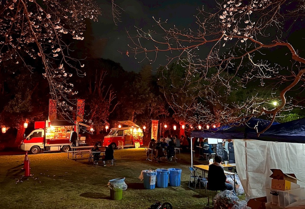 真鶴に来て最初の年、家族で昼間に見に行きました。桜は確かに綺麗ですが「ふーん、夜になるとライトアップもするんだね」といった感想。それから昨年も昼間に見に行ってしまい「しまった、夜にくるべきだったんだ!」という後悔。そして今年。真鶴商工会青年部に入れてもらった私は、朝の8:30から夜の21:00まで、商工会のテントでお手伝いすることになりました。