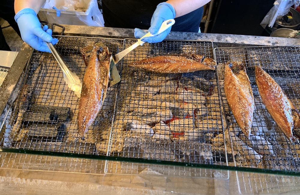 お店では最高の干物を、ちょうど良く熾火(おきび)となった炭で丁寧に、ちょうど良い火加減で焼いてもらえます……魚を捌(さば)く時に「海腹川背」という言い方がありますが、炭火で焼く時も海魚は腹側(身の方)を先に、川魚は背中側(皮の方)を先に焼くそうです。一匹一匹、鉄串で火の通りを確かめたら、焼き上がります。
