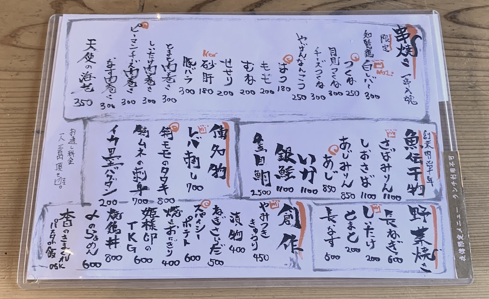 一番のウリは外看板にも掲示されている「知覧鶏」の焼き鳥!! 知覧と言えば鹿児島にあるお茶の葉っぱも有名な所ですよね。そんな自然いっぱいの地で、市場に出回る鶏肉(およそ生後50日で出荷)の数倍、450〜700日かけてしっかりと育てられ、熟成された知覧鷄は、コクと歯ごたえが違うそうです。お店で手打ちされて、これもまた炭火で丁寧に焼かれます。