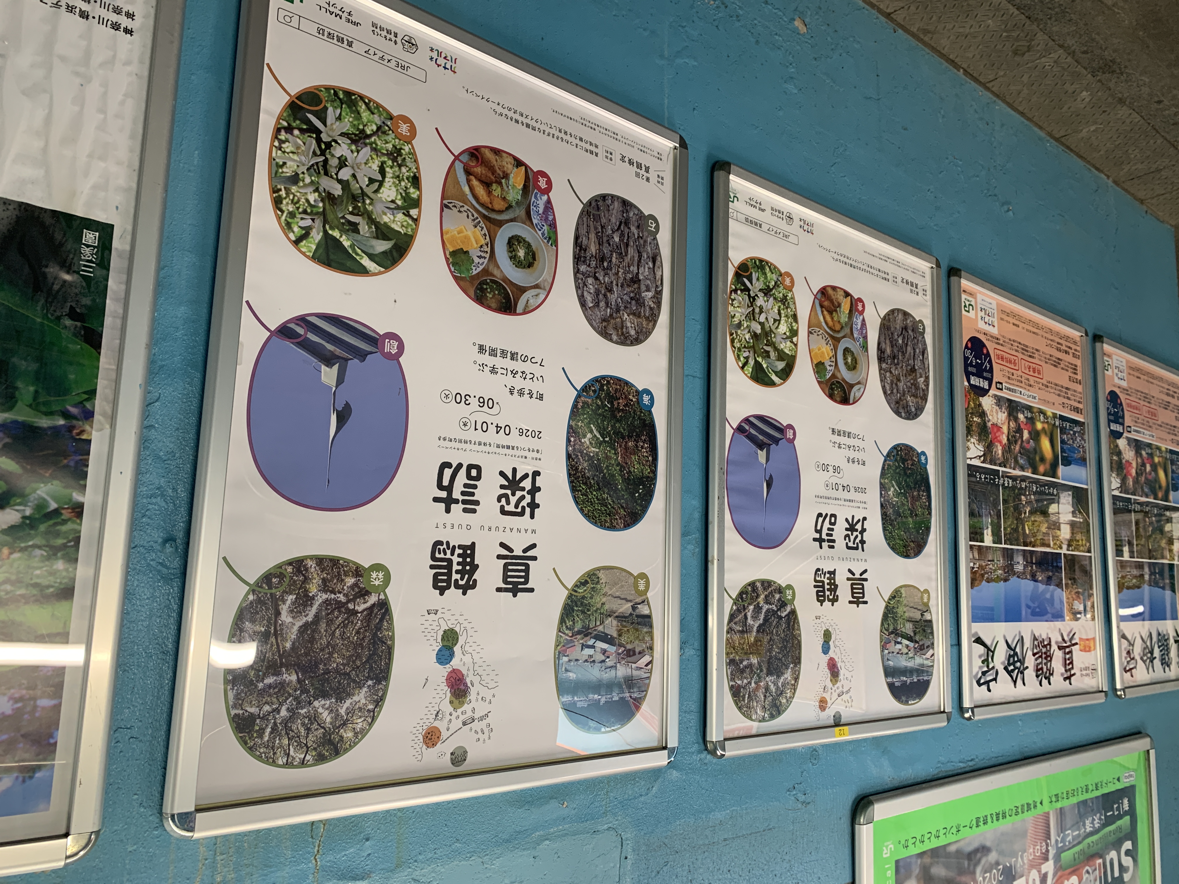 つい先日、JR東日本さんが開催されている「第2回真鶴検定」のご案内を記事にしてお伝えしたばかりですが、さらにもう一つ。真鶴駅構内のポスター掲示のコーナーを改札方面から歩いてくると、上にある写真が下の写真のような眺めになります。「真鶴」から始まるのは同じ四字熟語ですが、よく見ると「探訪」……。