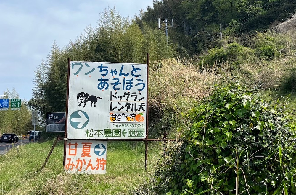 東京方面から真鶴に車で来ると必ず目に止まるのがこの看板、『松本農園』さんのワンちゃんです。当『まなNAVI』のヘッダーにも登場させて頂きましたが、私が尊敬する「みかん畑通信」を発行する『松本農園』さんで、みかんの花を摘みながらチンキ剤やアロマオイル、オードトワレを作る講座です。