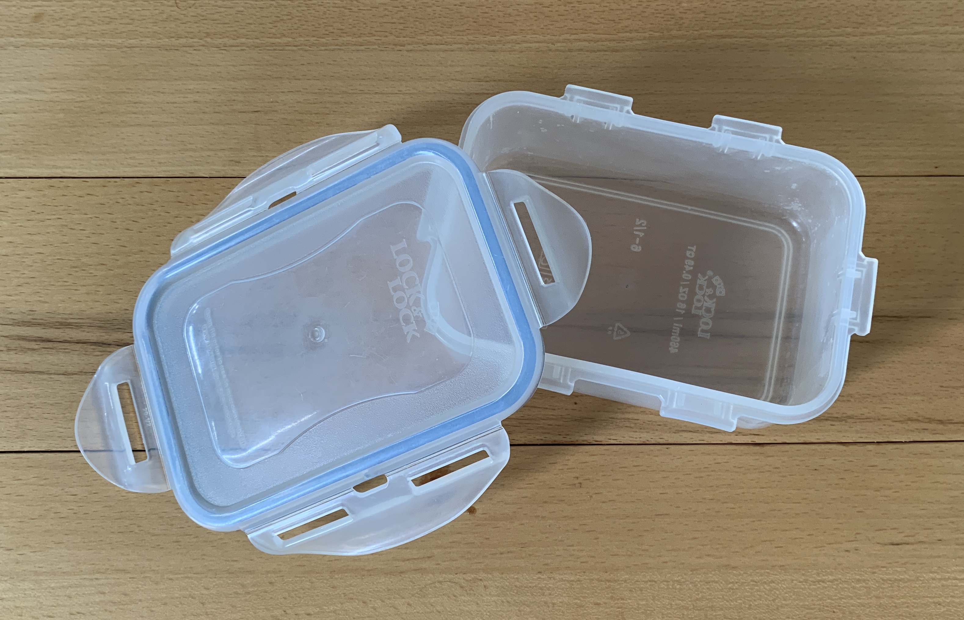 後は高校時代に使っていたお弁当箱。何の変哲もない「タッパー」とも呼ばれるコンテイナーです。これは青い部分がゴムパッキンになっていて、丁寧にもパチン、パチンと蓋をロックする留め具まで付いています。お弁当の汁などが漏れることは絶対にありません!