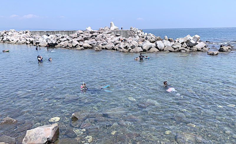 右の方はタイドプールになっていて、小さなお子さんが小魚を捕まえに中を覗いているのをよく見かけます。私はすごい魚がいるかもしれないと思い、海から上がった後によく覗いて見ています。