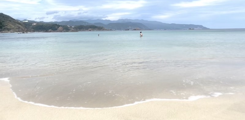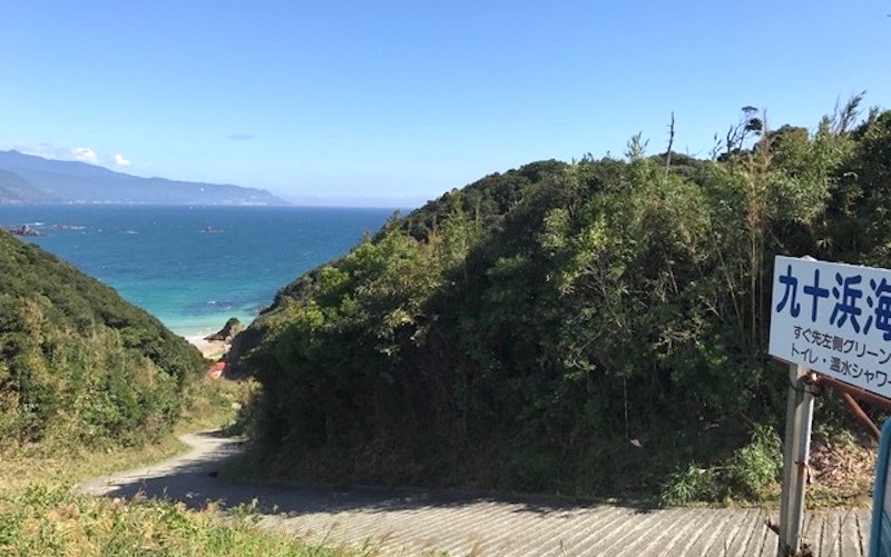 九十浜はとても透明感のある美しい海で(水質はAAで最高基準らしい)、砂浜は白くて、水平線が見え、両隣には緑の自然が広がっています。以前は天皇家の別荘の須崎御用邸の一部だったこともあり、まるで秘境のような素敵なところです。「OVER DRIVE」という映画の撮影スポットにも使われていたらしいです!