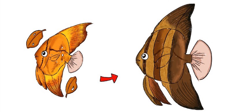 幼魚は枯れ葉にカモフレージュせるために赤茶色で、漁港を漂いながら成長していき、背びれとしりびれが大きく発達しているのが特徴です。