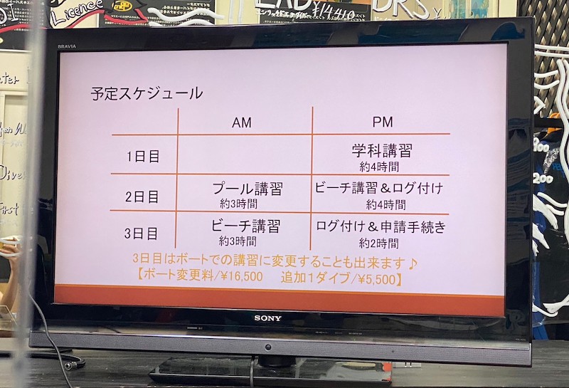 私が受けたライセンス取得までの大まかな流れは、①学科講習(e-ラーニング) ②プール講習 ③ビーチ講習 ④ボート講習(ビーチ講習からグレードアップさせ、ボート講習にしました) ⑤ライセンス取得!!