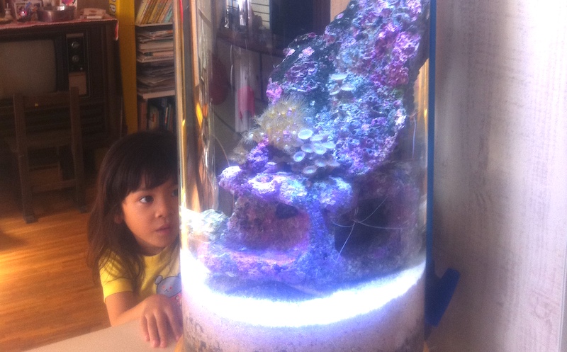 これまで水槽はリビングに置いていましたが、トイレにお引越しするメリットが3つあります。1つ目は暗めで直射日光を避けられること。直射日光が当たると海水の温度が高くなってしまい、コケが沢山生えてきてしまいます……。