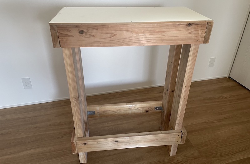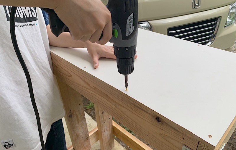 「電動ドライバー」で木ネジをしっかり奥まで入れて水槽台を組み立てました。電動ドライバーは小さい頃からたまーに使っているので、余裕のよっちゃんでした! あとは、紙やすりを軽くかけてペンキで白色を塗るだけ! だと思っていましたが……