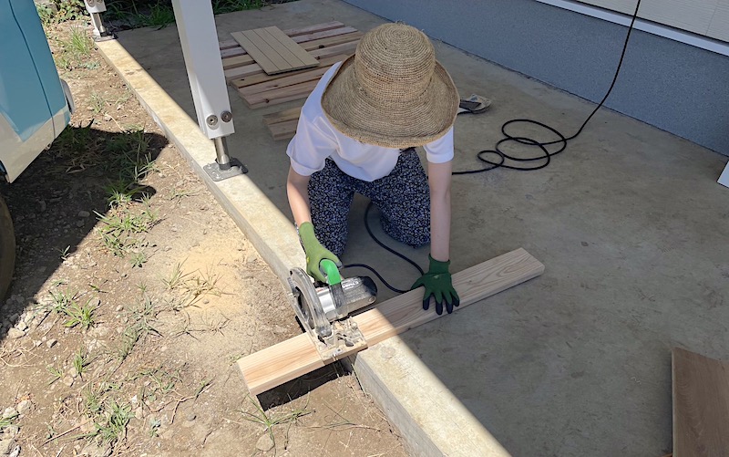 木材をカットするために使用したのは「電気マルノコ」。円形の歯を高速回転させながらカットします。「電気マルノコの歯が手に当たりそうで怖い……」と密かに不安に思いながらも頑張ってきれいに木を切ることが出来ました。