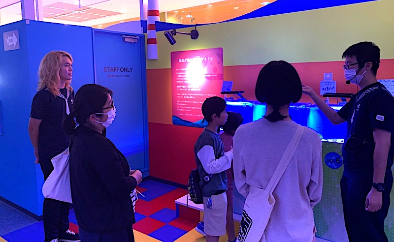 14:00になると幼魚水族館ツアーが始まりました。水族館ツアーは飼育員さんが水槽の中にいるお魚について詳しく解説してくれます。私は特に「ボロカサゴ」が脱皮をする魚だという話に驚きました。脱皮をするのは甲殻類だけかと思っていました……。