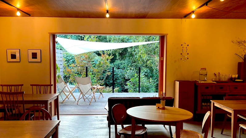 幼魚水族館から徒歩8分。静かな住宅街の中にひっそりと佇むオシャレなカフェがあります。デッキから緑が見渡せて、白いタープも張られているアウトドアっぽい雰囲気の『pechka(ペチカ)』というお店です。