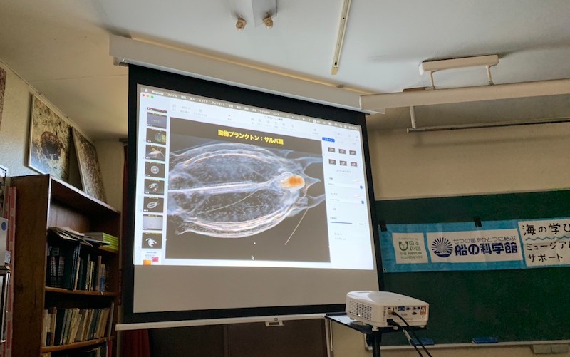 当日はまず座学からです。海洋のプランクトンの種類など、海洋調査の事前知識をプロジェクターを使ってわかりやすく教えてもらいました。プランクトンは大きくわけて2種類。
