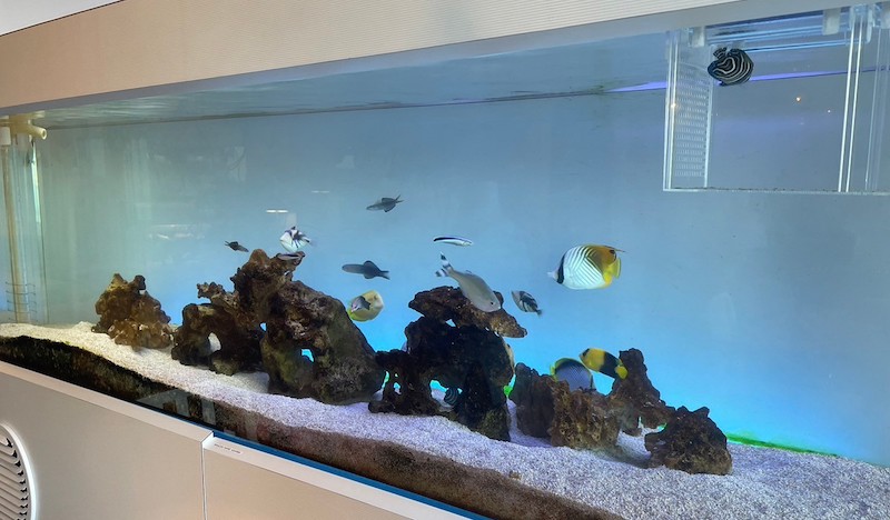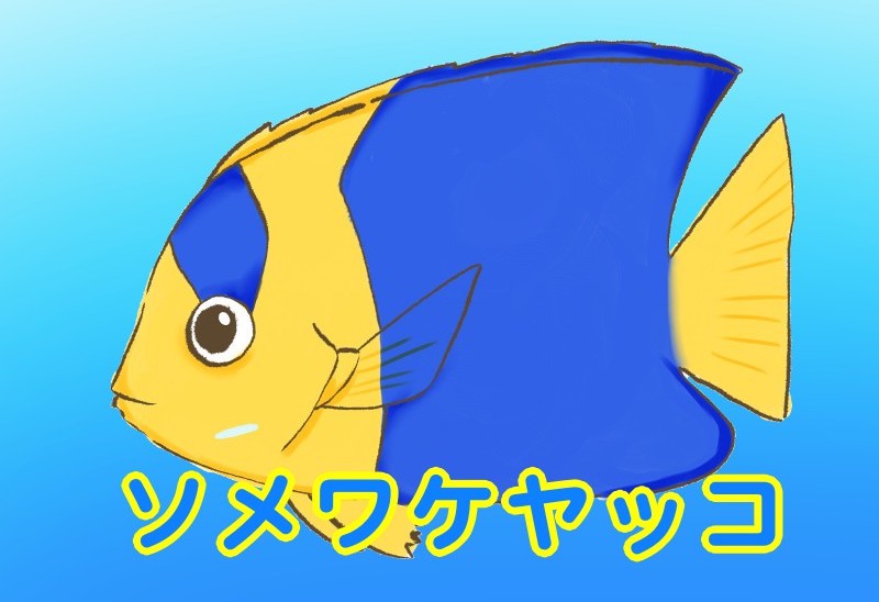 「honohono」の水槽の中にいる魚は、全て真鶴の海で泳いでいた熱帯魚だそうです! 私はこの水槽の中で特にソメワケヤッコが目に付きました。黄色と青のツートンカラーがとても綺麗です。