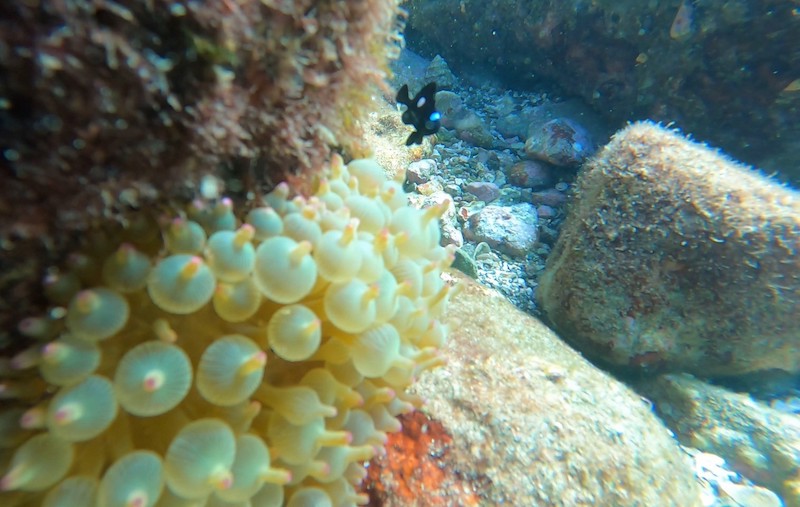 えびす島の中でも今まで行ったことのないサンゴとイソギンチャクが沢山見られる場所に行きました。いつも泳いでいるところよりも水深があって少し怖かったです。それに加えて、いつもより波のうねりが強くて泳ぐのも大変でした。