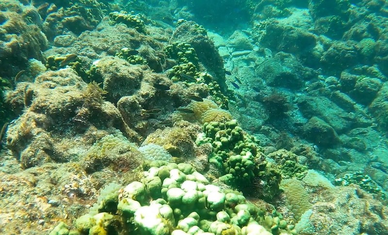 えびす島のサンゴ礁は太陽の光に照らされて緑色にきらきらと輝いていて綺麗でした。イソギンチャクの隙間からは、黒と白のツートンカラーのミツボシクロスズメダイが顔を出していてとても可愛かったです。
