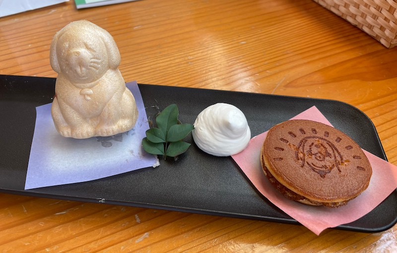 パリパリのもなかの皮に、松月オリジナルのあんこやみかん餡を自分で入れて食べます。もなかの香ばしい匂いがとても良く、美味しかったです。その他の「どら焼き」にもしいたけの焼印が入っていて、とってもかわいいです。