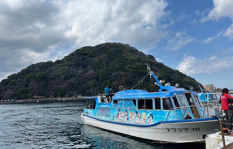 船内に入ると声優さんのサインが至るところにあり、それを見つけるだけでも楽しいです。淡島までは片道3分ほどなので「あっ」という間の船旅ですが、この日は天気も良くてデッキからの内浦の海の景色は最高でした!!