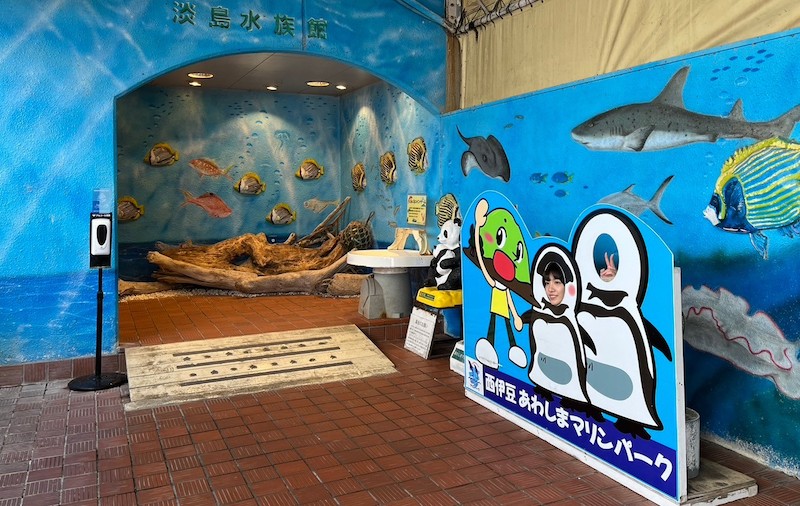 淡島水族館の入口に顔出し看板があったので記念撮影! 私の左隣にいるキャラクターは「しまたろう」です。看板などに説明もなく描かれているので、何も知らずに行った人は「何のキャラクターだ?」と思う人もいるかもしれません。