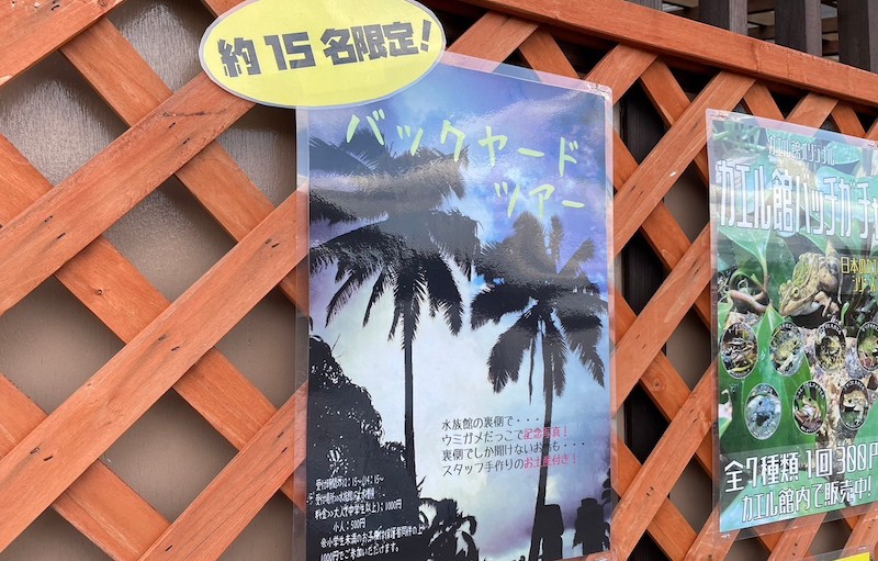 水族館の入り口では、水槽の裏側を見学できる「バックヤードツアー」のお知らせが掲示されていました。限定「約15名」と書いてあったので、混んでいるし、もう無理かな〜と思いつつ問い合わせてみると……。