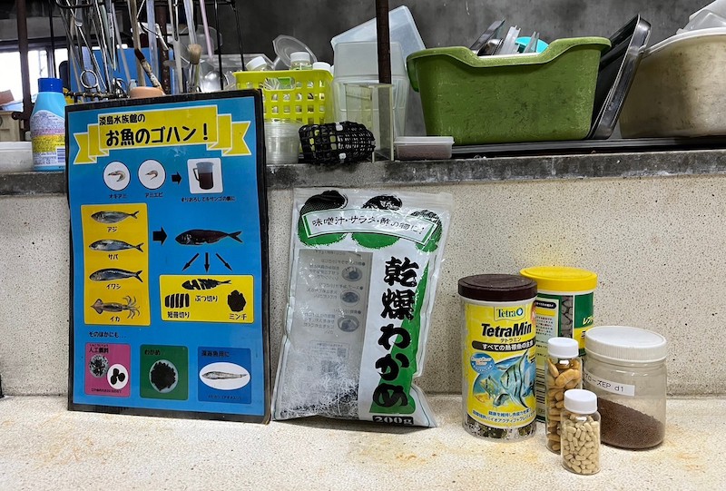 初めに、いつも与えている餌についてのお話から始まりました。普段の餌だけだとビタミン不足になって栄養が偏ってしまうので、魚からアシカやイルカにいたるまで、ビタミンの錠剤をときどき混ぜて与えているそうです。