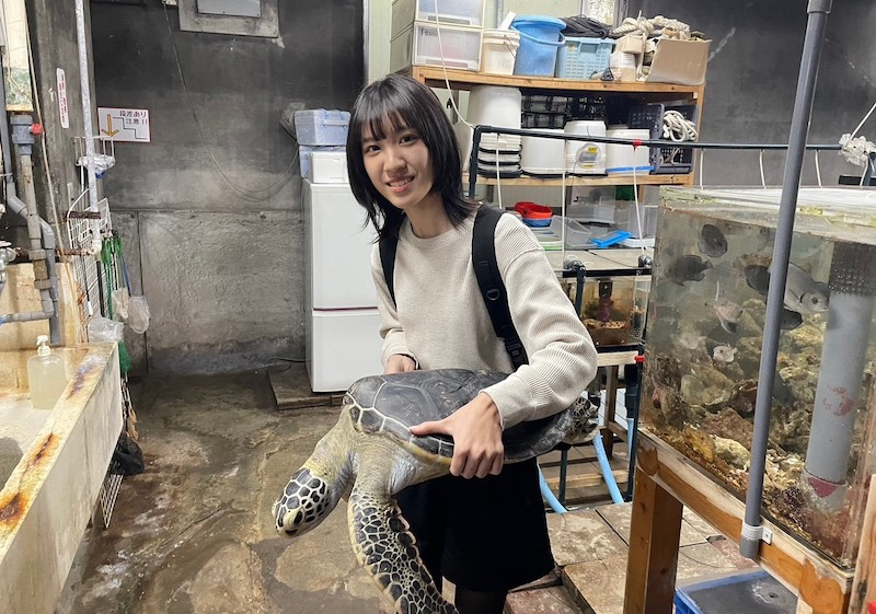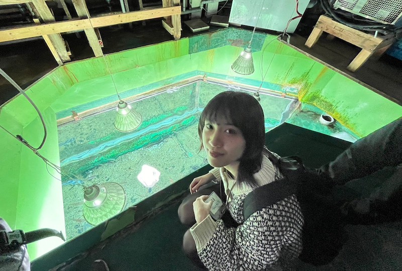 バックヤードでは1階の大水槽を上から覗くこともできます。少しでも足を踏み外したら水槽の中へ真っ逆さま!! ……とてもヒヤヒヤしました。そしてアオウミガメと記念撮影も!! 数秒間かかえているだけでも、とっても重かったです!!