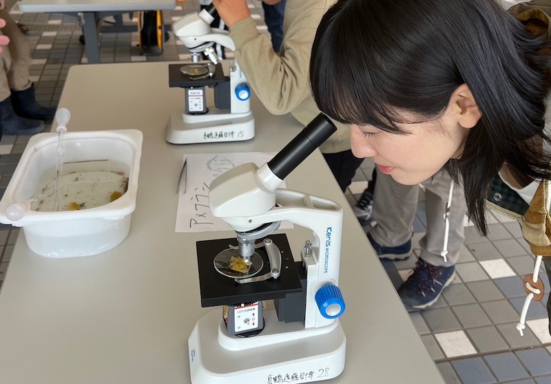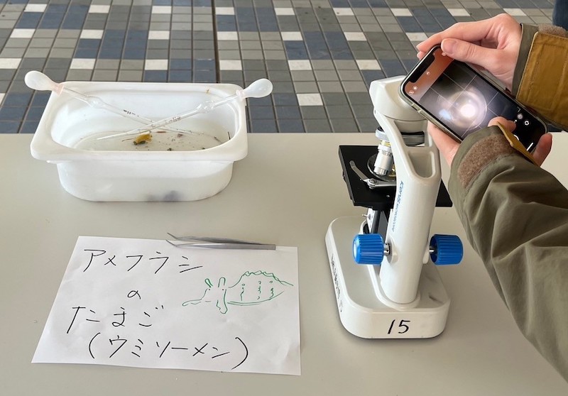 これはタイドプールなどで見られる「アメフラシ」という生き物の卵なんです。皆で顕微鏡で観察したのですが、成熟していくにつれて卵の色が変わり、ラーメンのような色になることは初めて知りました。
