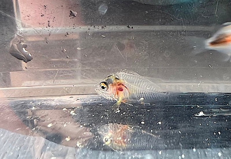 イワシの群れも落ち着き、「次は幼魚が集まってくれないかな」と集魚灯の周りに視線を落としていると、ゴミみたいなちっちゃくて黒い物体が浮かんでいました。そっと掬うと初めて見る透明な幼魚がとれました。
