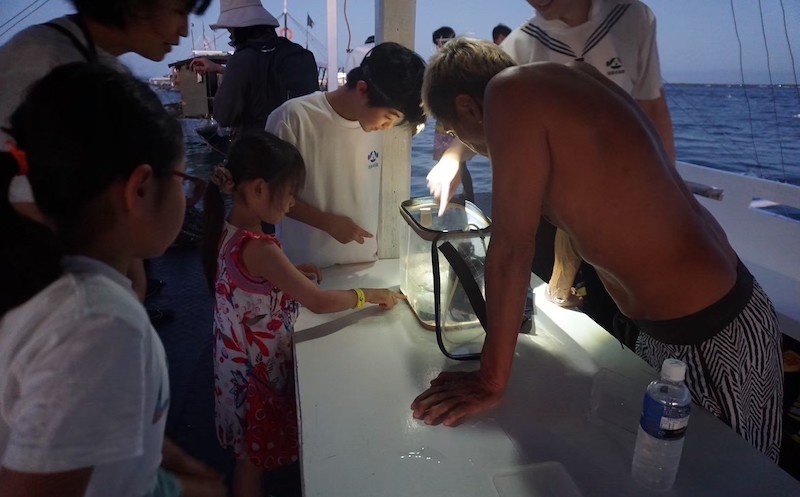中でも、貴重なのは鰻やアナゴやウツボの幼魚といわれるレプトケファルス幼生です。ツアーに同行していた「あやねちゃん」という小学生の女の子は、今回の夜の採集でレプトケファルス幼生を採ることが出来てとても喜んでいました。