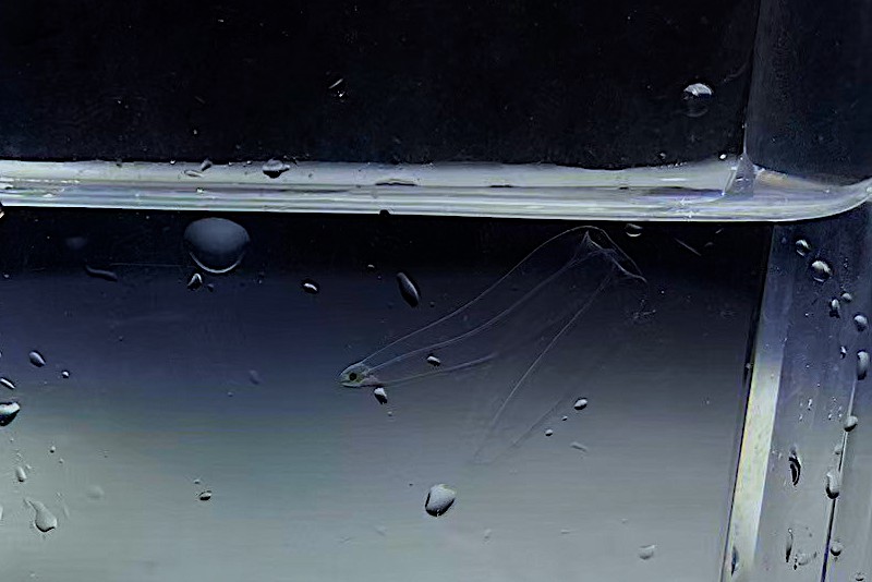 私自身も去年の香里武さんの「第一回幼魚サミット」でその存在を知ってからずっと憧れていました。その実物を初めて見て、他の透明な幼魚と比べてもひときわ神秘的なその透明さに感動してしまいました。