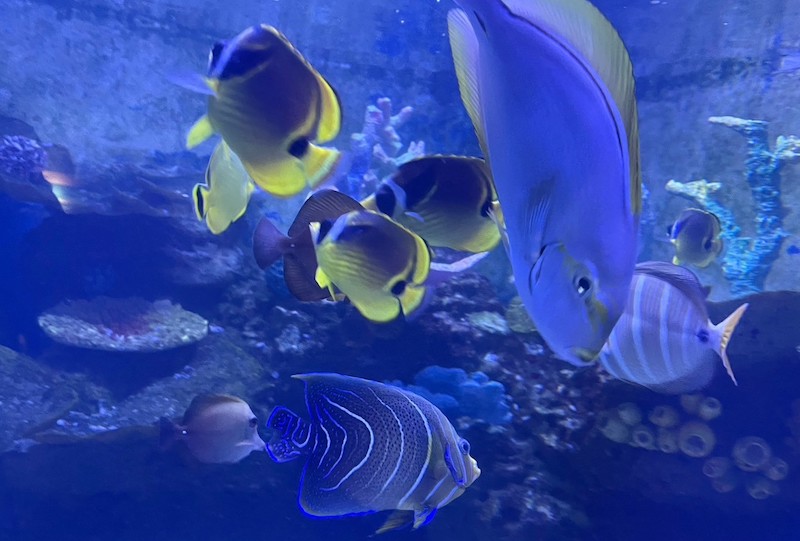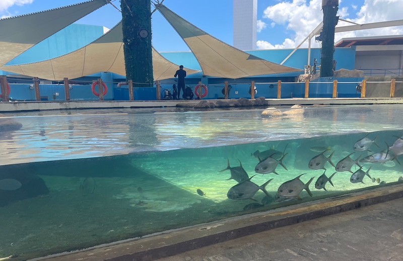 逆に、日本の水族館の水槽は魚との距離感を近くするためにできるだけ薄くて綺麗な水槽を使っています。しかしこちらの水族館は水槽が壁のようにぶ厚く、傷がたくさんついていました。