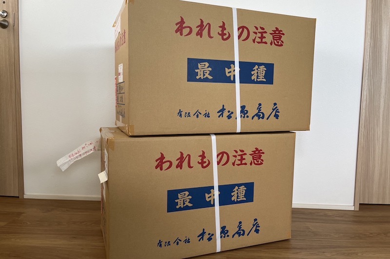 1ロット1,000組単位で注文できるので、自宅に大きな箱が届くと、もなか屋さんのようになってしまいました。最中はひとつずつ個包装してもらったので、皆さんの手に渡るまでパリパリのまま提供できます。そんなこだわりが詰まった最中は、パリパリなのはもちろん香ばしくてとっても美味しいです。
