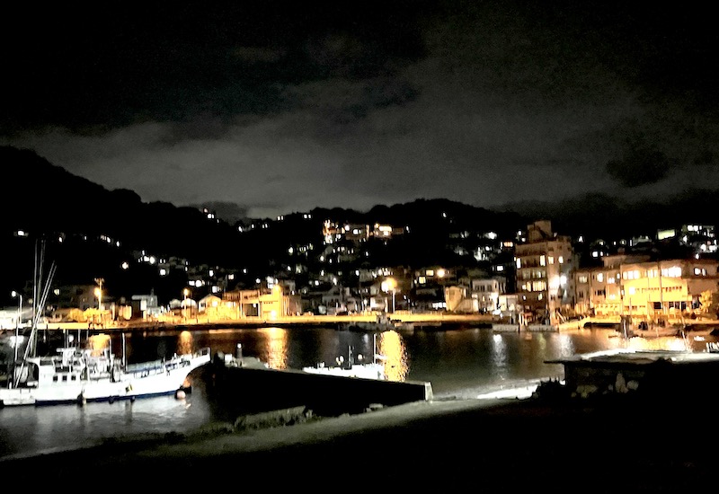 「東洋のリヴィエラ」とも呼ばれる真鶴町は、漁港を囲むようにすり鉢状の街並みが広がっています。夜になると家々の灯りが水面を照らし、幻想的な風景が浮かび上がります。集魚灯で採集する場所はそんな漁港の一角。